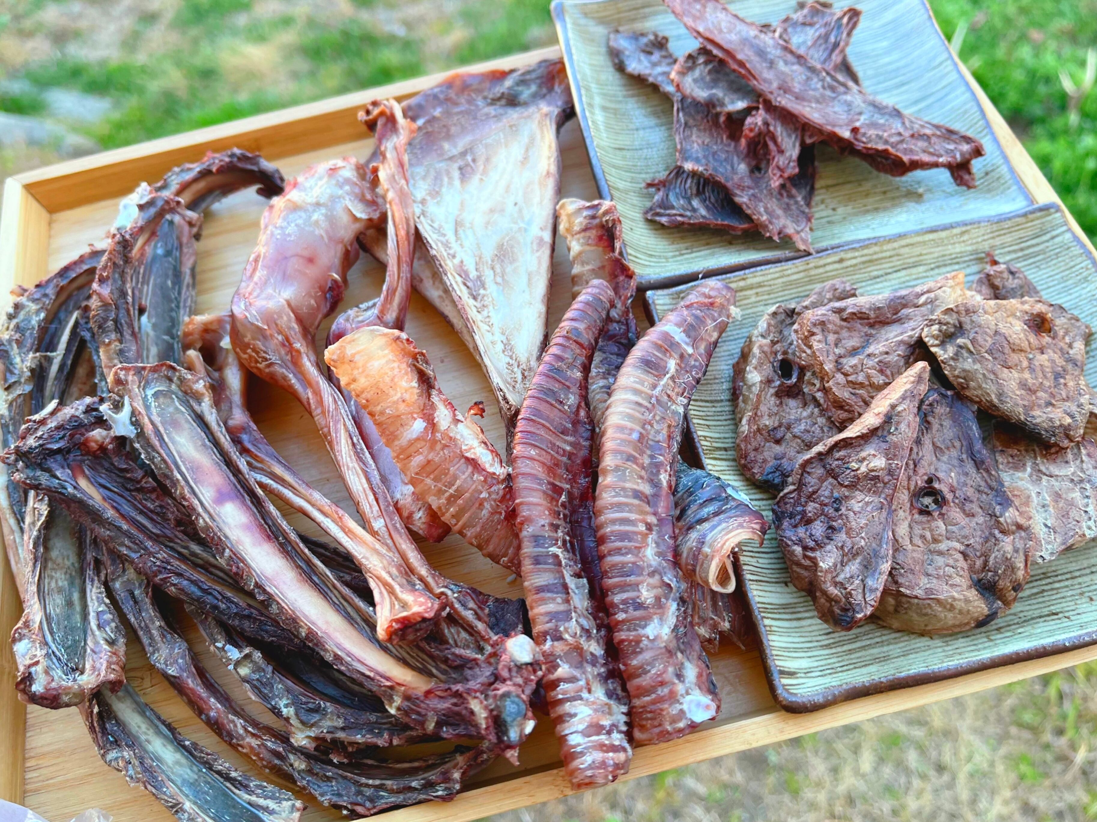 静岡県伊豆半島の南部に位置する 自然豊かな町"松崎町" そこで獲れた新鮮な鹿と猪を 許可を得た解体処理施設で捌き 加工・販売しています。 罠掛け→血抜き→解体→加工→パッキング まで自らの手で行っています。 いただいた命を余すところなく活用するために、食肉として販売されない部位をメインにペットフードにして販売しています。 ジビエ肉、 特に鹿肉は低カロリー低脂肪で、愛犬や愛猫のご飯としても大変人気があります。 ぜひ一度お手に取っていただけたら 嬉しく思います。